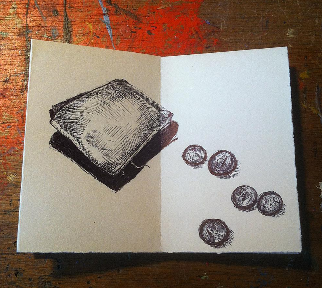 The Contents of my Pockets is a series of drawings of the items which are always in my pockets. I switch the same items from pocket to pocket when I change my pants. The book was created using bic pen on Murano paper.