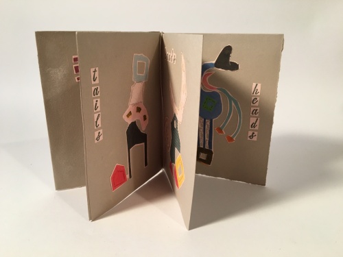 A ritual assumes the celebration of the unknown, involving mystery and hope. "Heads Tails" reflects the practice of seeking an answer by the simple toss of a coin, an act which also calls upon mystery and hope. The pages are reconstructions of earlier collages, collages of collages. The images are whimsical, abstract, and light, implying an open-ended celebration in the face of vast unknowing. This or that, heads or tails.