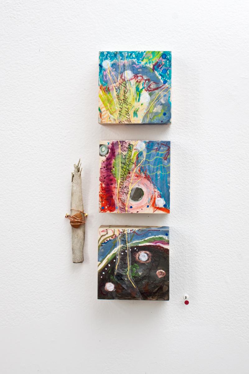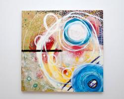 Conversations with Land is a new body of work by Damini Celebre. The gallery is dotted with tiny and small paintings on panels and one work constructed of four 24 x 24 inch panels. In these works she pulls the sky down into the same plane as the earth, and air swirls amid them. There is no up, no down — no representation — it is a spiritual universe. Undulating energy reveals itself in each mark.